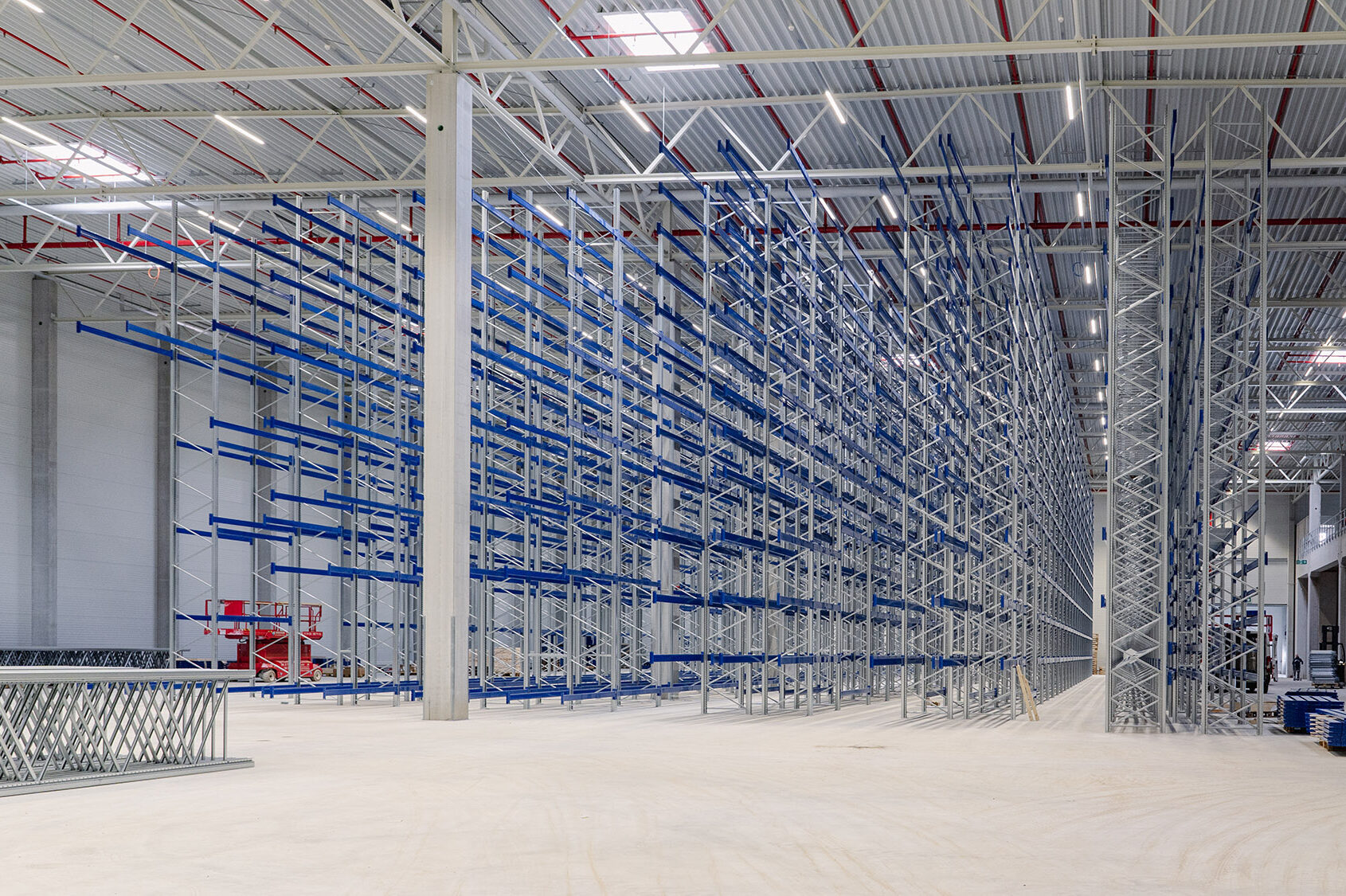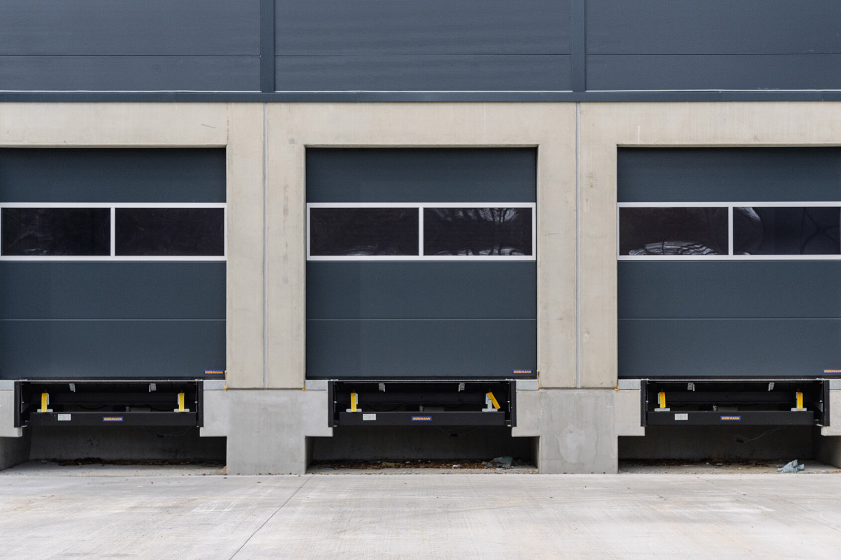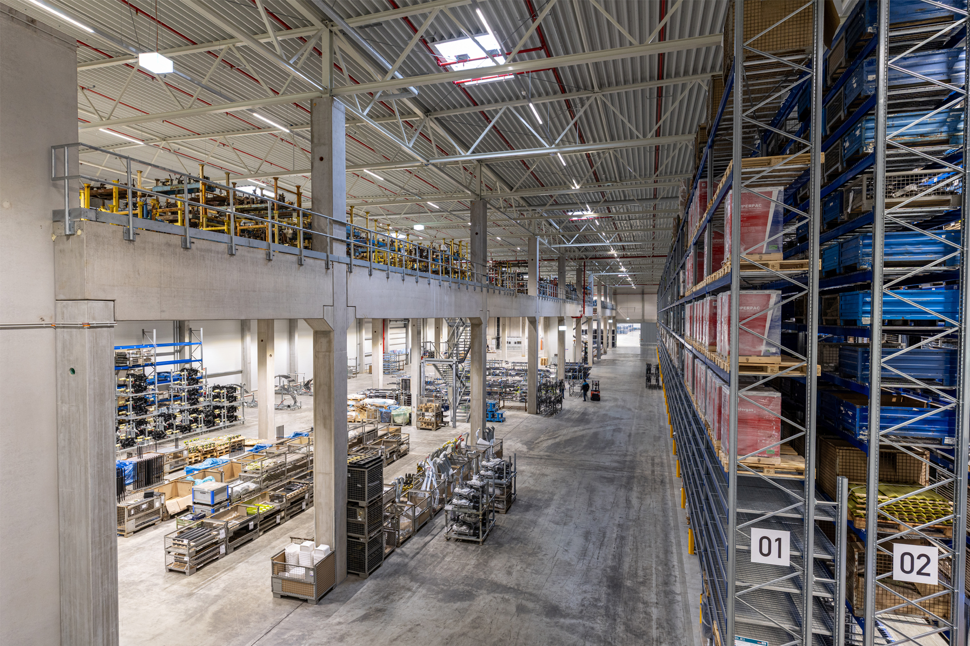 Die Halle wurde in einem wirtschaftlichen Stahl-Skelettbau mit festem Stützenraster konzipiert. Stützen aus Beton und weit spannende Fachwerkträger sorgen für eine große Spannweite mit flexiblen Grundrissen.