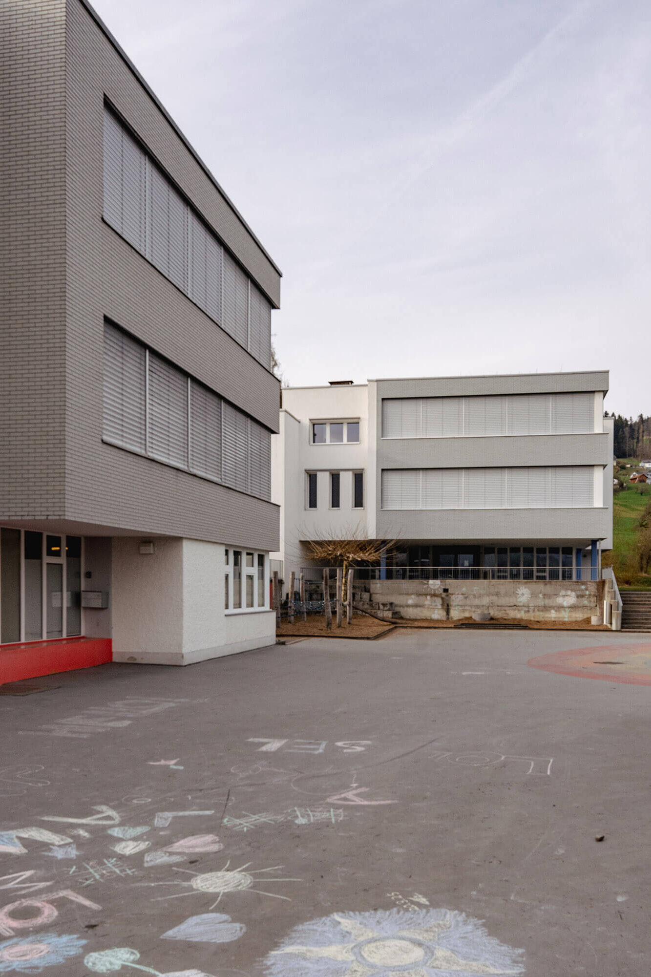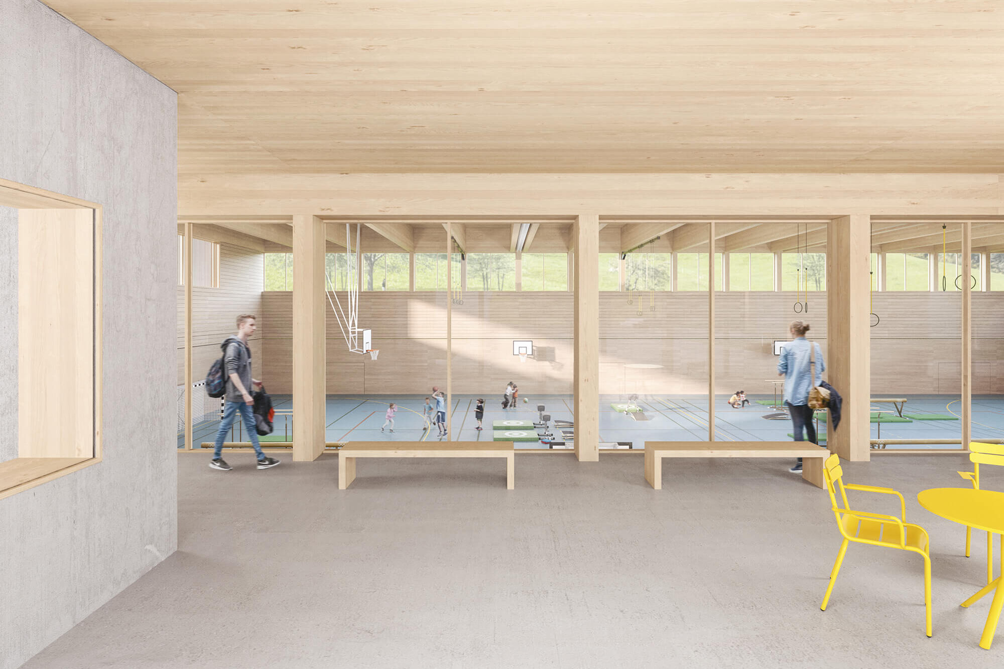 Im Rahmen eines Wettbewerbs mit beschränkter Teilnahme konnte sich unser Entwurf gegen 12 Mitbewerber durchsetzen. Die Positionierung der neuen Baukörper der Turnhalle sowie des Schulerweiterungsbaus in Ergänzung zu den bestehenden Schulbauten überzeugte die Jury. Durch die Positionierung der Baukörper werden neue Zwischenräume und Freiflächen geschaffen, die einen Mehrwert für alle Nutzer des Areals sind.